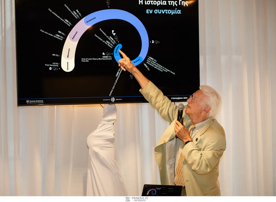 Ομιλία του Προέδρου της Ακαδημίας Αθηνών Σταμάτη Κριμιζή. Μεταξύ άλλων αναφέρθηκε στην εικόνα του διαστήματος και την ιστορική πορεία του πλανήτη Γη. Τόνισε ποσό σημαντικό ρόλο θα παίξει στην βιωσιμότητα του πλανήτη το επίπεδο του διοξειδίου του άνθρακα στην ατμόσφαιρα και πως αυτό συνδέεται με την θερμοκρασία της Γης .Κλείνοντας αναφέρθηκε στα δύο κουτιά της Πανδώρας , την τεχνητή νοημοσύνη και την διαχείριση της κλιματικής κρίσης.