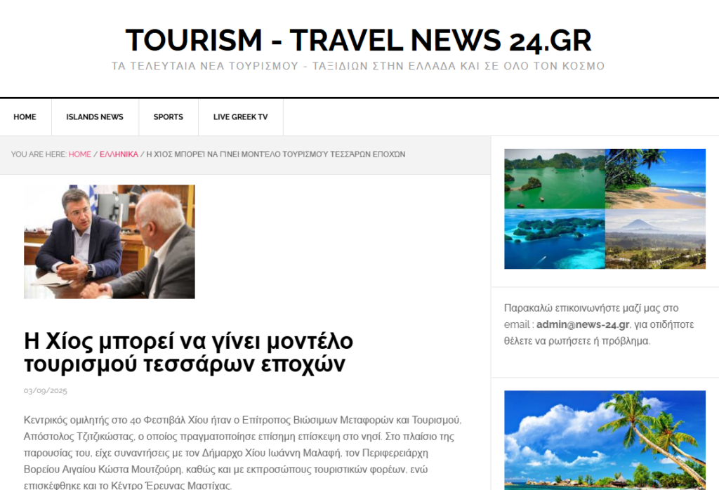 TRAVEL-TOURISM.NEWS-24.GR: Η Χίος μπορεί να γίνει μοντέλο τουρισμού τεσσάρων εποχών