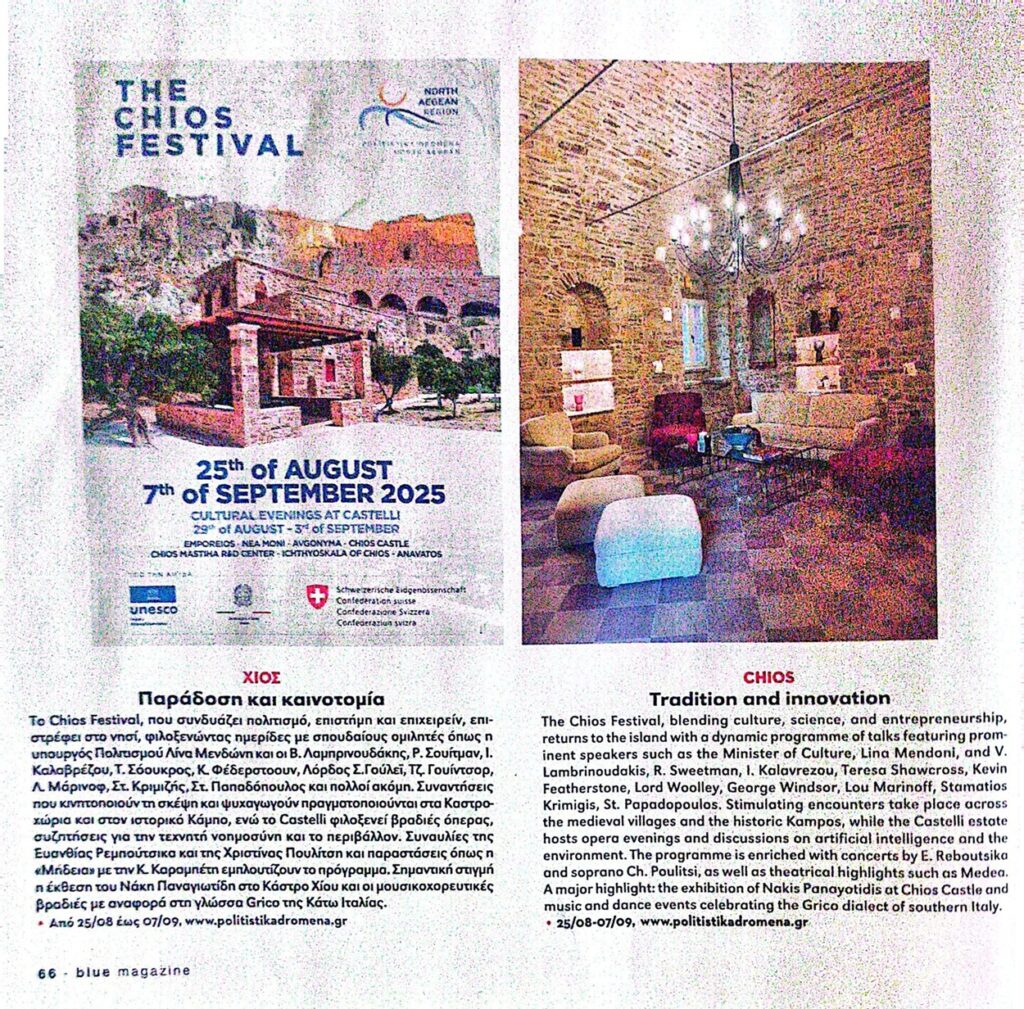 Η δυναμική προβολή της Χίου και του 4ου «Φεστιβάλ Χίου» έχει ήδη ξεκινήσει, με σημαντικές αναφορές σε κορυφαία ελληνικά ΜΜΕ. Στο τεύχος της 31ης Ιουλίου 2025, η εφημερίδα «ΚΑΘΗΜΕΡΙΝΗ», σε άρθρο της δημοσιογράφου Μαργαρίτας Πουρνάρα, υπογραμμίζει την ευρύτητα του φετινού προγράμματος, σημειώνοντας χαρακτηριστικά ότι «το Φεστιβάλ απλώνεται από την αρχαιολογία έως την τεχνητή νοημοσύνη». Στο ίδιο αφιέρωμα παρουσιάζονται οι ποικίλες θεματικές και οι ξεχωριστές τοποθεσίες που θα φιλοξενήσουν τις εκδηλώσεις, αποτυπώνοντας τη μοναδική πολιτιστική δυναμική της Χίου.