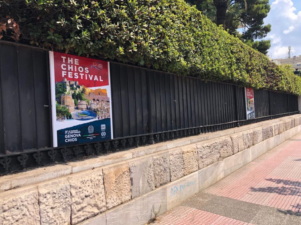 Το Φεστιβάλ τελεί υπό την αιγίδα της UNESCO, της Ιταλικής και της Ελβετικής Πρεσβείας στην Ελλάδα. Στο πλαίσιο αυτό, έξω από την Ιταλική Πρεσβεία, επί της Λεωφόρου Βασιλίσσης Σοφίας, έχουν αναρτηθεί αφίσες που προβάλλουν τη Χίο και το 4ο Φεστιβάλ της, προσκαλώντας το αθηναϊκό κοινό και τους επισκέπτες της πόλης να γνωρίσουν από κοντά τον θεσμό.